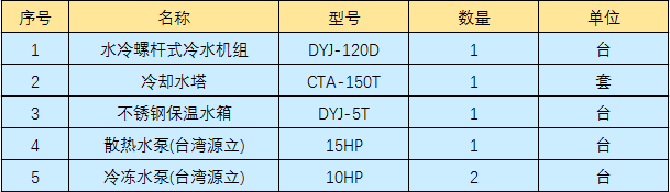 清遠(yuǎn)皮革廠壓花機橡膠輥冷卻,通過工廠技術(shù)人員核算,需要配120HP水冷螺桿式冰水機組2臺,客戶直接百度水冷螺桿式冰水機找到東躍進(jìn)制冷,通過幾天的電話及文字溝通確認(rèn),最終訂購2臺120HP水冷螺桿式冷水機組以及輔助設(shè)備,型號及數(shù)量如下表: